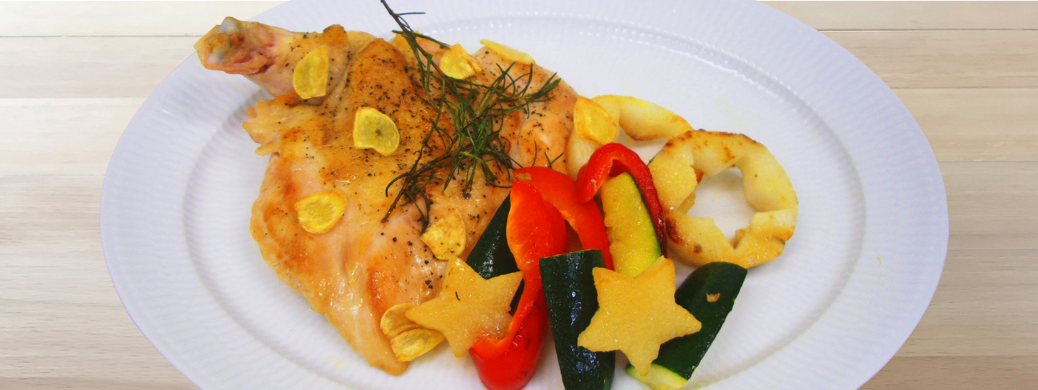 11.裏返して周りに付け合せの野菜を回り入れて弱火で焼く 約12分